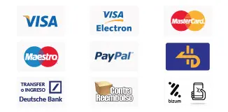 El pago de las compras se efectúa por tarjeta bancaria, PayPal, mediante ingreso o transferencia bancaria y contrarrembolso.